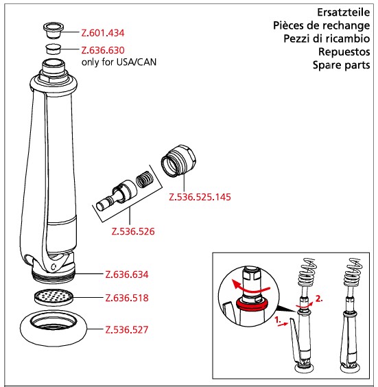 Im harten Alltagsbetrieb einer Gewerbeküche ist auch die robusteste Handbrause nach vielen Jahren täglichen Einsatzes einmal verschlissen bzw. verbraucht. Aber da der Schweizer Hersteller KWC für das gesamte Armaturenangebot für Gastronomieküchen der Serie KWC Gastro eine vorbildliche Ersatzteilversorgung anbietet, erhalten Sie hier in unserem GastroXtrem Onlineshop für Gastronomiebedarf aus Rosenheim nicht nur die komplette Handbrause mit der Bestellnummer Z.536.530.145, sondern auch das passende Ersatzteil, wie hier den passenden Stössel mit der Artikelnummer Z.536.526.