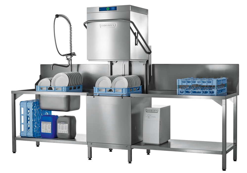 Die Universaler Durchlauf-Haubenspülmaschine von HOBART ist sowohl für die gerade als auch für die Aufstellung über Eck geeignet. Der Haubenspüler hat eine mit Ein-Knopf-Bedienung und eine allseits geschlossener Haube und integrierter Wasserenthärung.